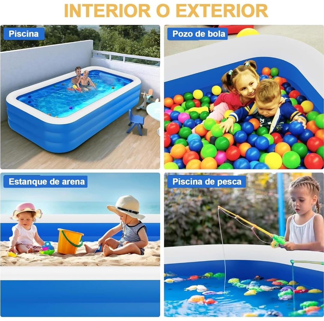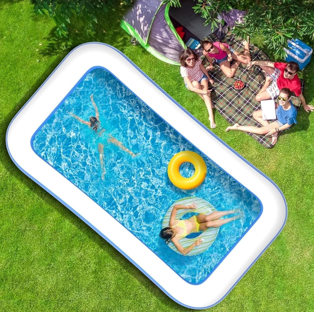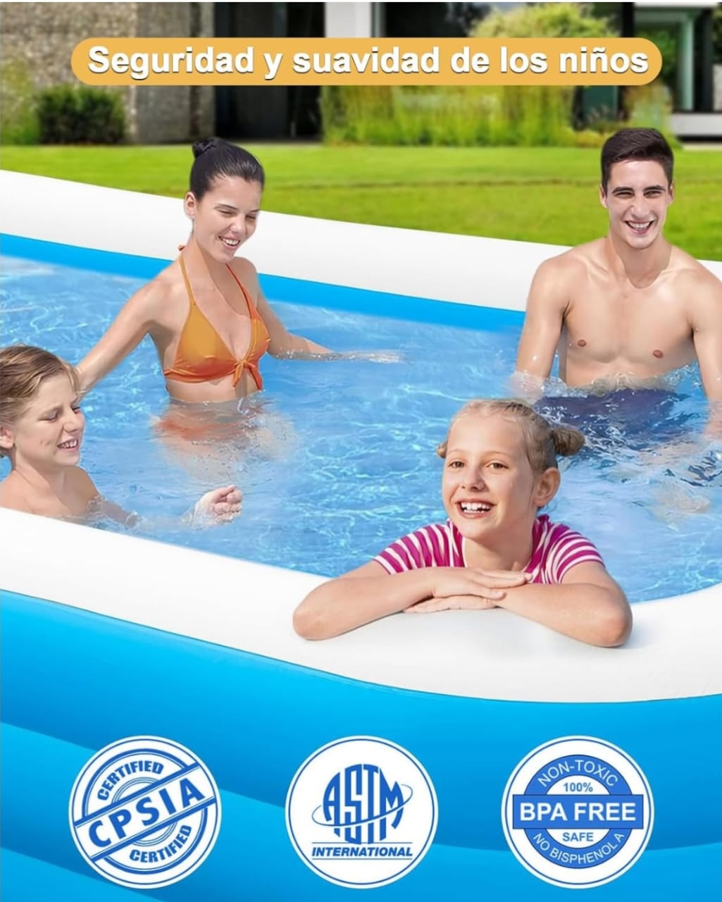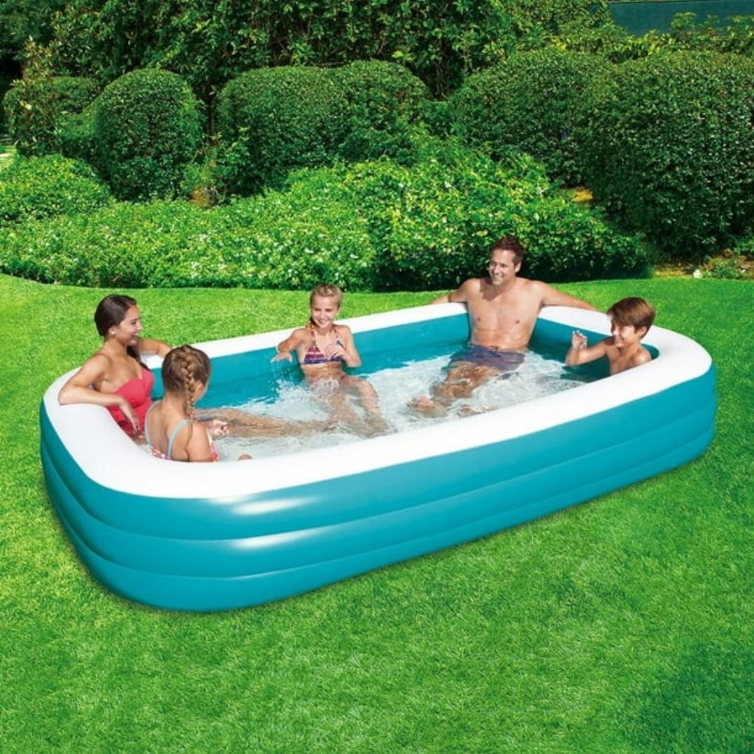 Alberca inflable rectangular 305 x 183 x 56 cm Summer Waves, elaborada con materiales resistentes de PVC en color blanco y azul. Es apta para disfrutar la temporada de verano con 6 o más personas.