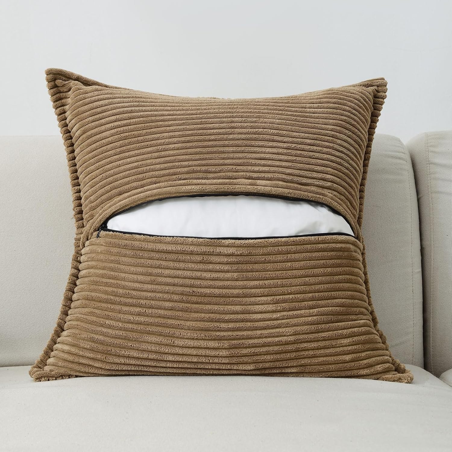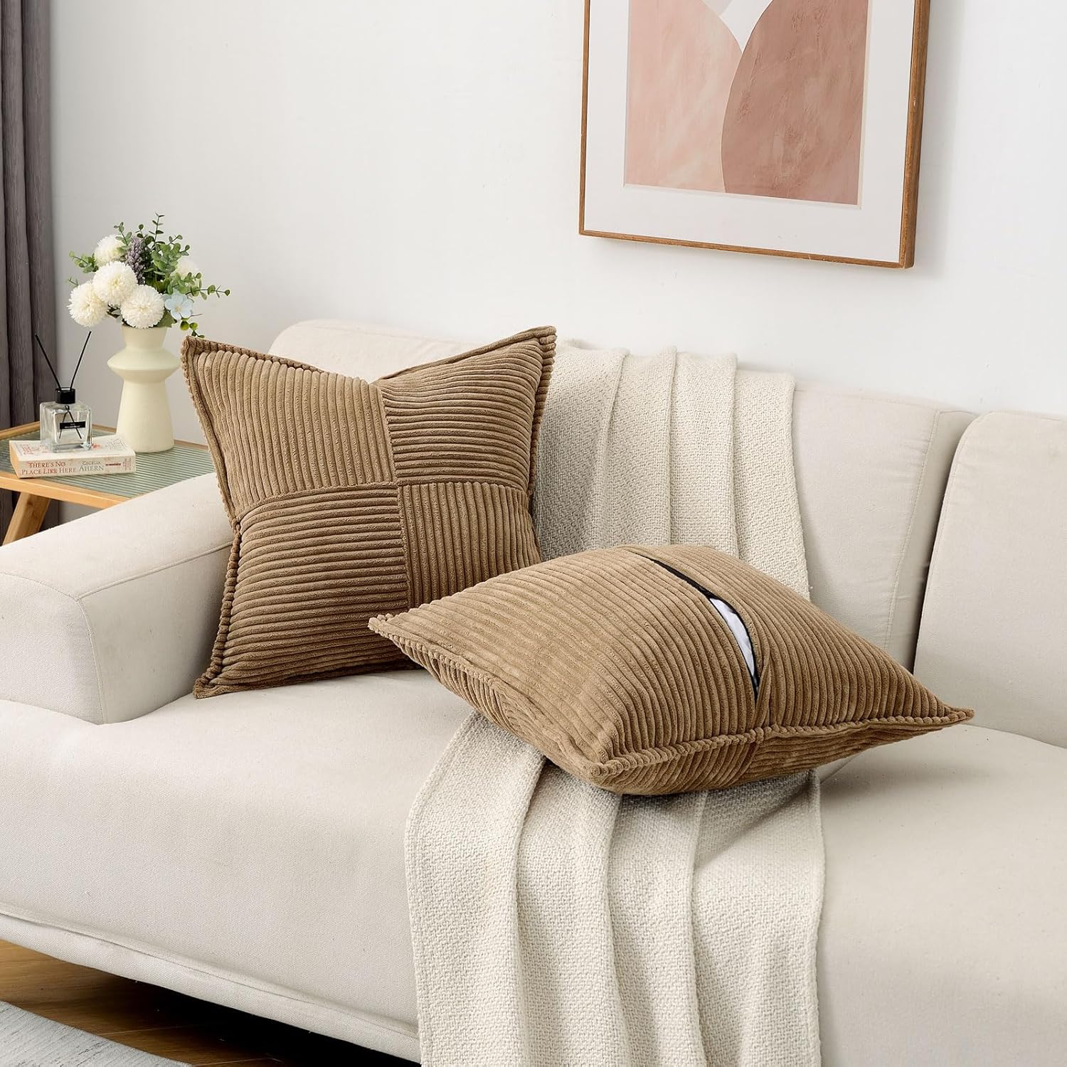 HAUSSY Juego de 2 fundas de almohada marrones de 18 x 18 pulgadas, pana suave y sólida a rayas/borde ancho, fundas de cojín cuadradas decorativas